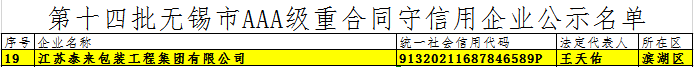 為鼓勵企業增強信用責任意識,弘揚誠信守約的社會風尚,經市重合同守信用企業認定委員會評審,市政府決定,命名江蘇泰來包裝工程集團有限公司等145家企業為第十四批“無錫市AAA級重合同守信用企業”。